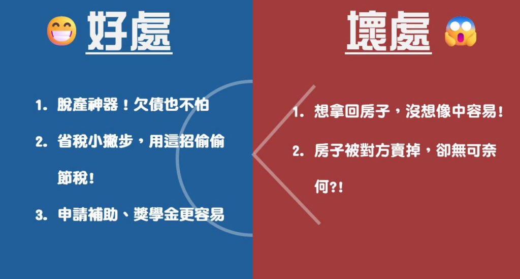 有沒有發現,常常聽到有人明明是自己買的房子,卻硬是登記在別人名下?這招到底在玩什麼?有什麼好處、壞處?來來來~一次講給你聽: